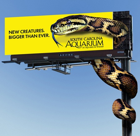 - Extensions. When you see a billboard with an extension, you look at it, simple as that. It’s an attention grabber, and often gives you a little more space for your message. I’ll even give New Hampshire Motor Speedway credit for using one in the cheesy billboard shown in #4. Attractions often have the opportunity to get crazy with extensions, and if you have dollars in the budget to make it happen, don’t hesitate – get creative. This one from the South Carolina Aquarium is a great example of how much fun you can have with extensions.
