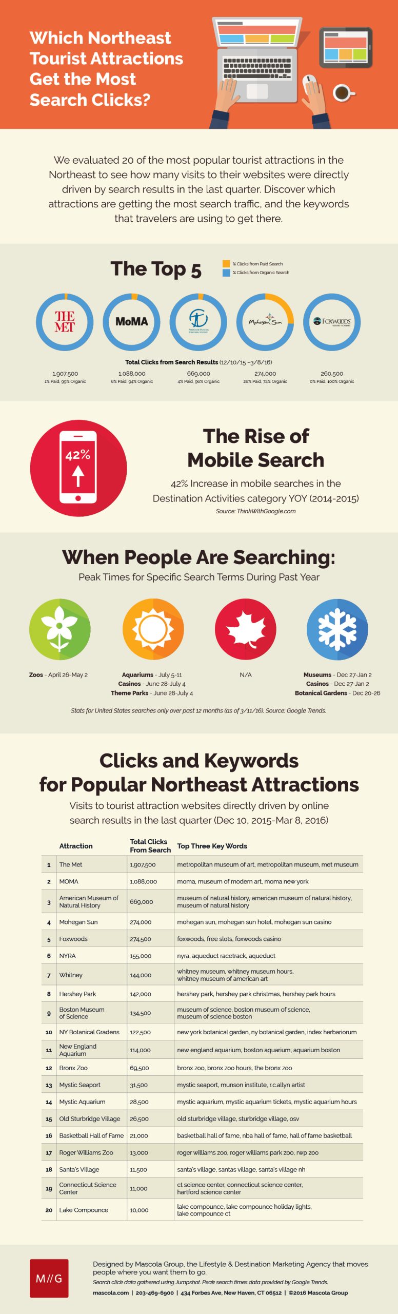 The infographic below offers a look at 20 popular Northeast tourist attractions, and how many clicks they get directly from search. We’ve also taken a look at search marketing for tourist attractions vs. organic search, as well as which keywords tourists are using to find the websites, and it’s interesting to examine the differences amongst competitors.